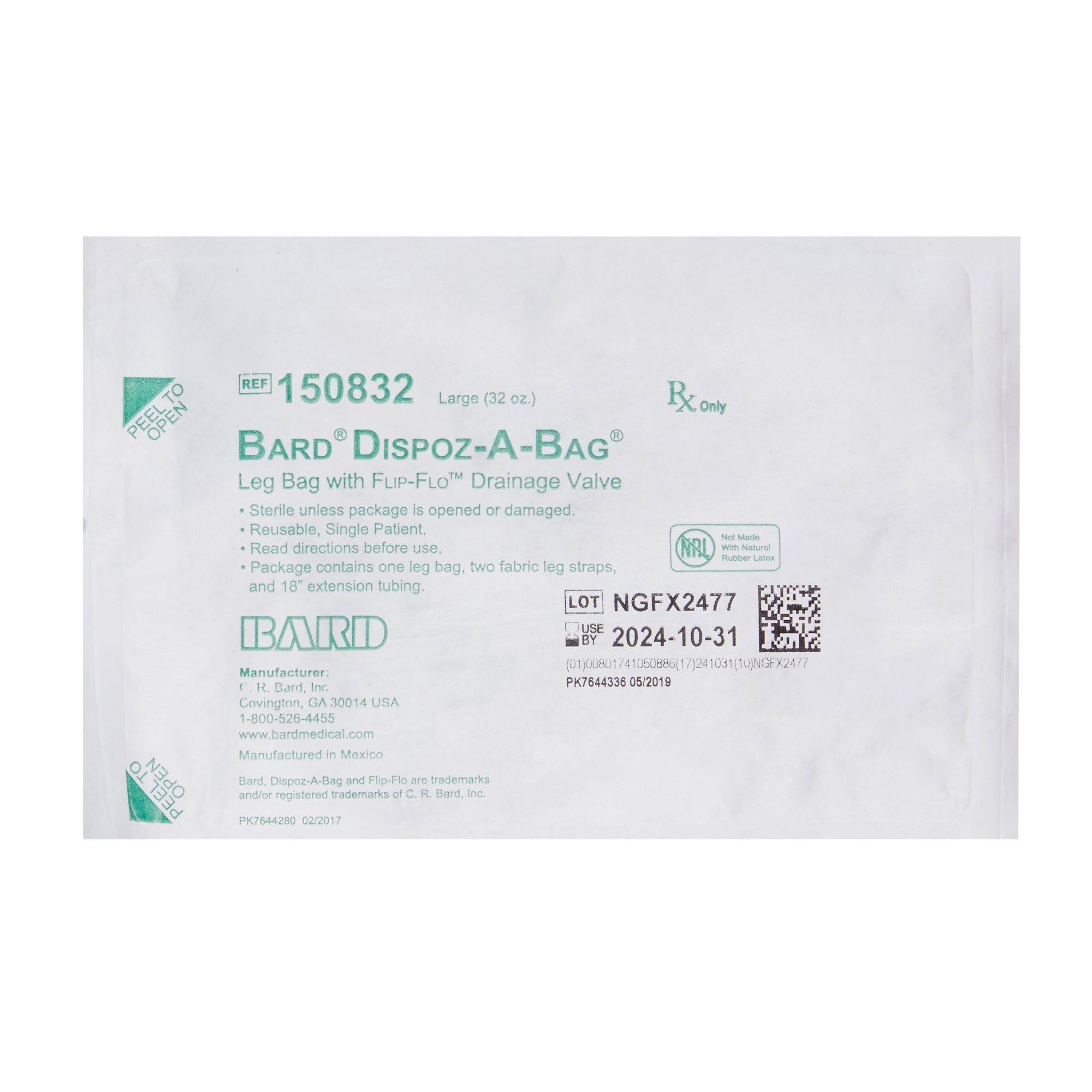 Bard Urinary Leg Bag Bard® Dispoz-a-Bag® Anti-Reflux Valve Sterile 950 mL Vinyl #150832